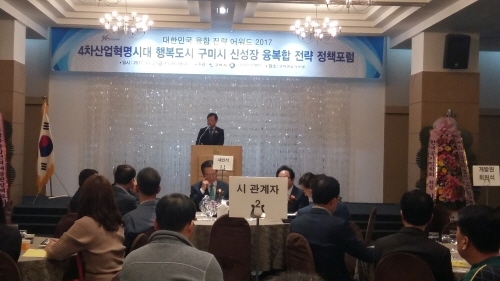 구미시가 (사)경북 융합전략개발원(원장 이선규)과 공동으로 지난 27일 구미 센츄리호텔에서 회원, 공무원, 시민 등 100여명이 참석한 가운데 ‘행복도시 구미시 신성장 융복합 전략 정책포럼’을 가졌다.