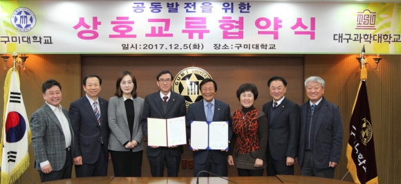 구미대학교(총장 정창주)가 5일 본관 3층 회의실에서 대구과학대학교(총장 박준)와 공동발전을 위한 교류협약(MOU)을 체결했다고 밝혔다.