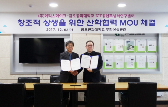 금오공과대학교 ICT융합특성화연구센터(센터장 김동성)가 민·군 ICT 융복합 및 무인항공 개발을 위해 ㈜메티스메이크(사장 배영주)와 MOU를 체결했다.