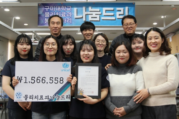 구미대학교가 물리치료과(학과장 정영준) 자원봉사동아리 ‘나눔드리(회장 허누리)’학생들이 유니세프(Unicef)로부터 감사장을 받았다고 8일 밝혔다.