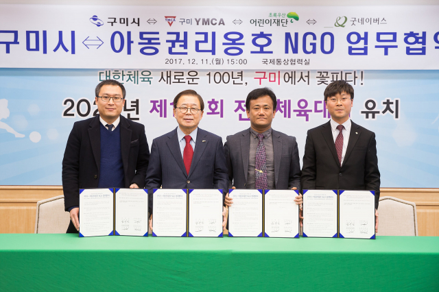 구미시가 지난 11일 오후 3시 시청 국제통상협력실에서 구미YMCA(사무총장 나대활), 굿네이버스 경북서부지부(대표 박세정), 초록우산 어린이재단 경북아동옹호센터(소장 권영철) 관계자 등 10여명이 참석한 가운데 아동권리보호 및 증진을 위한 업무협약을 체결했다.