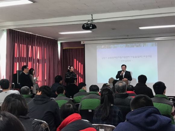 김천시가 29일 어모면 동좌리에 위치한 김천시중증장애인자립센터에서 이용자와 장애인가족 및 주민이 참석한가운데 '나눔숲 조성사업'을 위한 주민설명회를 열었다.