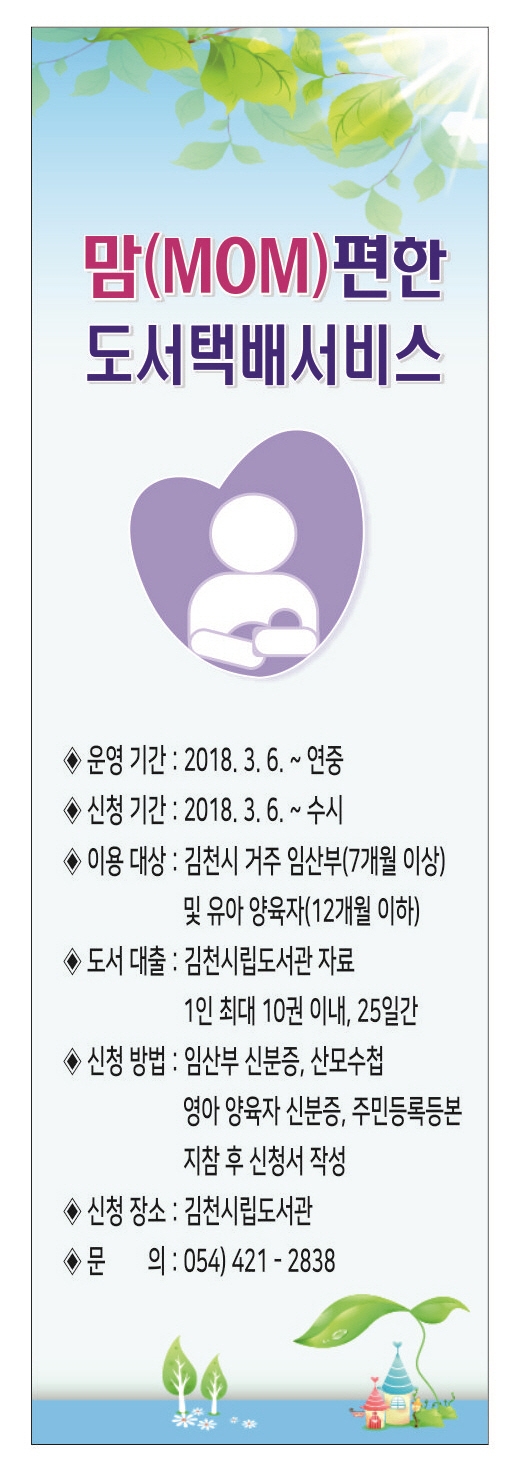 맘(MOM)편한 도서택배서비스는 김천시에 거주하는 7개월 이상의 임산부와 12개월 이하의 영아 양육자를 대상으로 실시되며, 신청자는 월1회 김천시립도서관 소장도서를 무료로 집에서 받아 볼 수 있다.