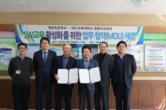 야은초등학교(교장 장준호)가 23일 대구교육대학교 컴퓨터교육과와 SW교육 활성화를 위한 업무 협약을 체결했다.