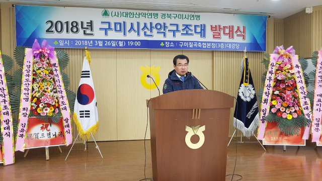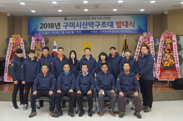 구미시산악연맹(회장 김영호)이 지난 26일 구미칠곡축협3층 대강당에서 산악사고 예방과 안전등산 문화 보급을 위해 구미시산악구조대(대장 김철영)을 주축으로 대원 17명이 참석한 가운데 발대식을 가졌다.