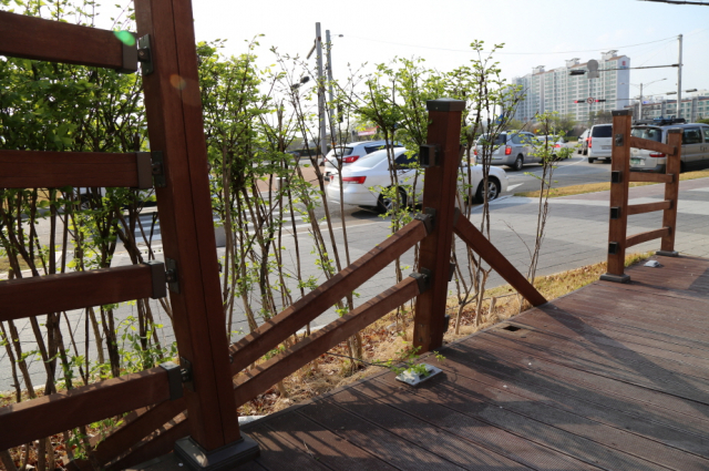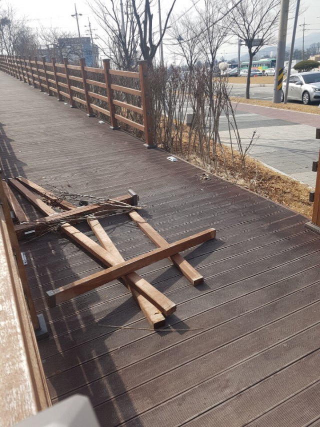 지난달 3일 구. 금오공대의 구미경찰서 이전지 옆 IT의료융합센터 동에서 도로로 내려오는 나무계단 가드레일 2구간이 뽑혀져 목재가 나뒹굴고 있었다. 하지만 1개월이 지난 10일 현재 떨어져 나간 목재를 대충 세워놓았지만 정비도지 않은채 방치되고 있는 실정이다.