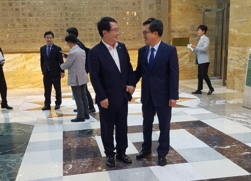 백승주 국회 예산결산특별위원(구미갑)이 지난 21일 열린 2018년 제1차 추가경정예산안 관련 예산결산특별위원회 전체회의 직후 김동연 부총리와 만나 KTX구미역 정차사업의 중요성에 대해 거듭 강조했다고 밝혔다.