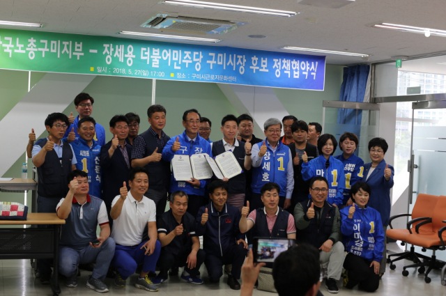 한국노총 구미지부가 27일 구미시근로자문화센터에서 더불어민주당 장세용 구미시장 후보를 지지선언 하며 '6·13지방선거 구미시장 후보 노동존중 정책연대 협약식'을 가졌다.
