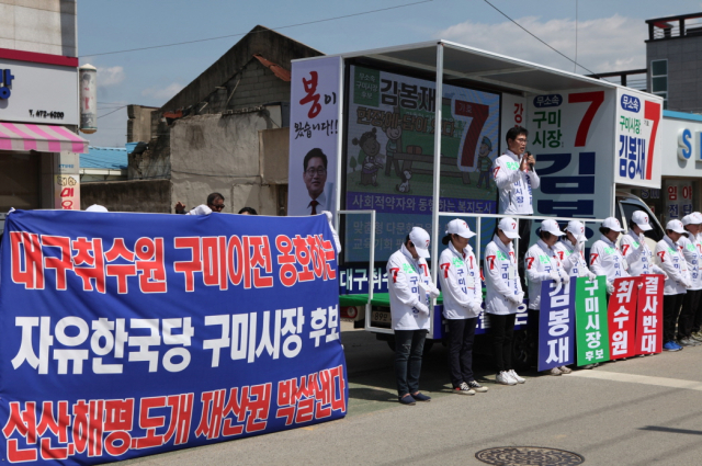 김 후보는 “대구취수원 이전 문제는 백년대계를 내다보고 결정해야 할 물 문제를 자유한국당 홍준표 대표와 그에 아바타들, 더불어 민주당 홍의락 국회의원 등은 비정상적인 개발논리와 정치논리로 이 문제를 해결하려 해서는 안 된다”고 비판했다. 이어 “대구취수원 구미 이전은 해평면, 고아읍, 옥성면, 무을면, 선산읍, 도계면 일대 개발제한 구역 등으로 편입되는 생존권이 달려있다”며 “주민 재산권 침탈을 구미시장 후보로서 더 이상 묵과 할 수 없고 자유한국당과 더불어민주당의 일부 위정자들이 구미시민에게 상처 준 댓가는 반드시 일벌백계 하겠다”고 주장했다.