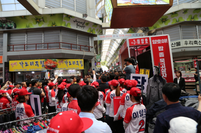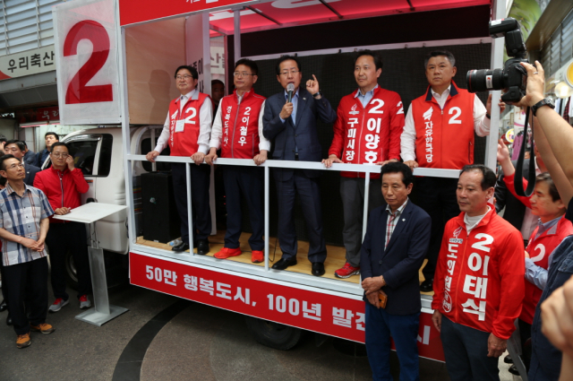 자유한국당 홍준표 대표가 1일 오후 1시30분 경북 구미시 새마을중앙시장을 찾아 지지를 호소했다.