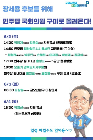 더불어민주당 장세용 구미시장 후보측이 구미지역 지원유세를 위해 전·현직 유력 국회의원 등이 대거 구미로 지원유세를 올 예정이라고 1일 밝혔다.