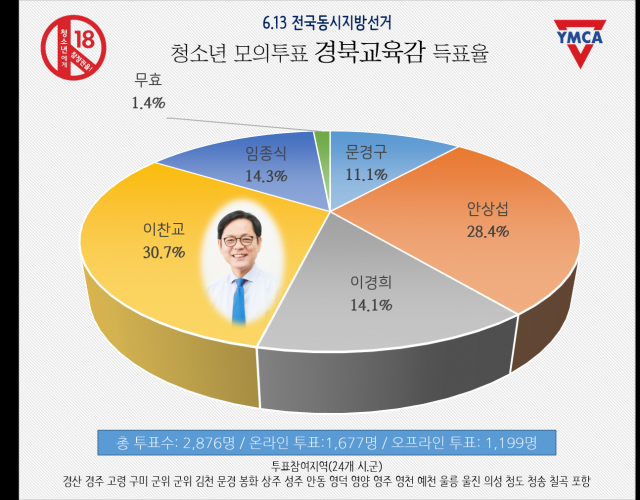 실제 선거에서는 자유한국당 이철우 후보(52.1%)가 도지사로 임종식 후보(28.2%)가 교육감으로 당선됐다. 하지만 청소년 모의투표에서는 더불어민주당 오중기 후보(47.1%)와 이찬교 후보(30.7%)가 각각 도지사와 교육감으로 당선됐다.