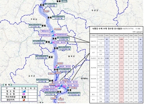 환경부는 이번 낙동강 수계 미량 유해물질인 과불화화합물과 관련 과불화헥산술폰산(PFHxS)은 발암물질로 지정된 항목은 아니며, 과불화옥탄산(PFOA)의 검출수준은 외국 권고기준(외국 권고치 : 미국 0.07㎍/L(PFOS + PFOA합계), 캐나다 0.6㎍/L, 독일 0.3㎍/L, 호주 0.56㎍/L, WHO 4㎍/L)에 비해 훨씬 낮은 수준이라고 밝혔다.