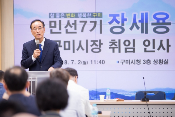 장세용 구미시장이 2일 민선7기 업무를 시작한 가운데 취임 인사 기자회견을 가졌다.