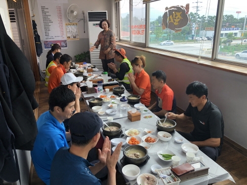 구미시 공단2동(동장 손정애)이 지나 18일 환경미화원 10명과 함께 폭염을 이겨내기 위해 삼계탕과 함께 생활쓰레기, 재활용품 수거에 대한 애로 사항을 청취하고 노고를 격려했다.