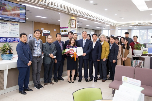 장세용 시장은 지난 19일 업무개시 전인 오전 8시50분 민원실에서 스마일왕 증서와 스마일 액자 게첨, 기념품과 꽃다발 증정 등 다양한 행사로 스마일왕 탄생을 축하하며 격려했다.
