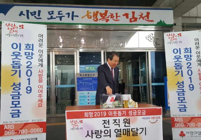 김천시는 지난달 21일부터 '사랑의 열매 20년, 나눔으로 행복한 경북'을 슬로건으로 내년 1월 31일까지 '희망 2019 나눔 캠페인'을 진행한다. 특히, 5일 오후 2시 시청 전정에서 경북공동모금회 주최, 김천시 후원으로 전 시민을 대상으로 이웃과 함께하는 사회적 분위기 조성과 나눔문화 확산을 위해 생방송으로 '희망 2019 가두 캠페인'을 전개할 계획이다.