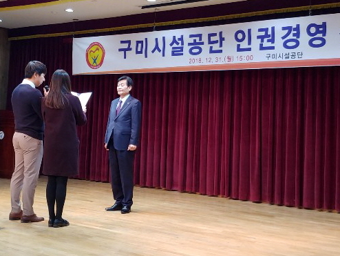 구미시설공단(이사장 권순서)이 지난해 12월 31일 올림픽기념관 소극장에서 전 임직원이 참석한 가운데 ‘인권경영 선포식’을 가졌다.