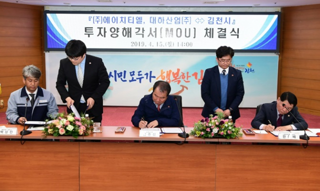 김천시(시장 김충섭)는 15일 김천시청에서 ㈜에이치티엘, 대하산업㈜와 김천1일반산업단지(2단계) 내 공장설립을 위한 투자양해각서(MOU)를 체결했다.