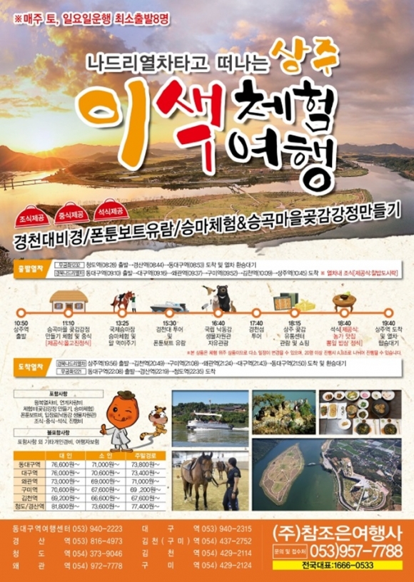 여행객들은 상주에 도착한 뒤, 낙동 승곡마을에서 곶감강정 만들기 체험과 푸짐한 시골밥상으로 식사를 한 후, 상주국제승마장으로 이동하여 승마와 말먹이(당근)주기 체험을 하게 된다. 또 인근에 위치한 낙동강 제1경인 경천대 산책과, 폰툰보트를 타고 낙동강의 아름다운 자연 풍광을 즐긴 후 국립 낙동강 생물자원관과 경천섬을 둘러보고, 농가맛집 두락에서 뽕잎밥상으로 상주의 맛을 즐기는 것으로 일정을 마무리하게 된다.