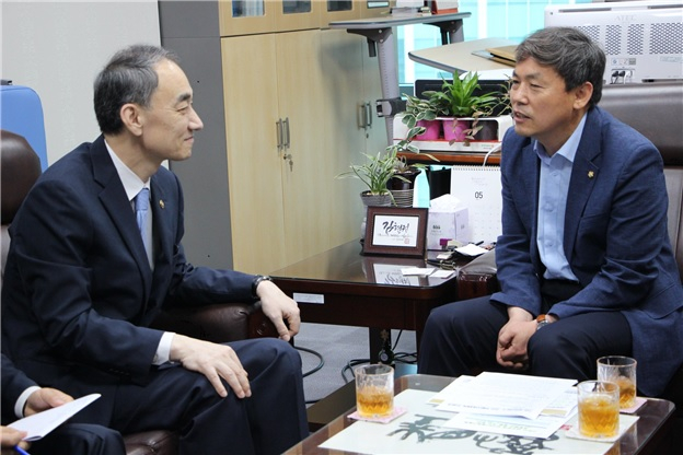 | ↑↑ 김현권 국회의원(오른쪽)과 왕정홍 방위사업청장(왼쪽)은 24일 국회 의원회관에서 면담을 갖고 구미시 방위산업 육성에 대해 협력을 추진해 나가기로 뜻을 모았다. |