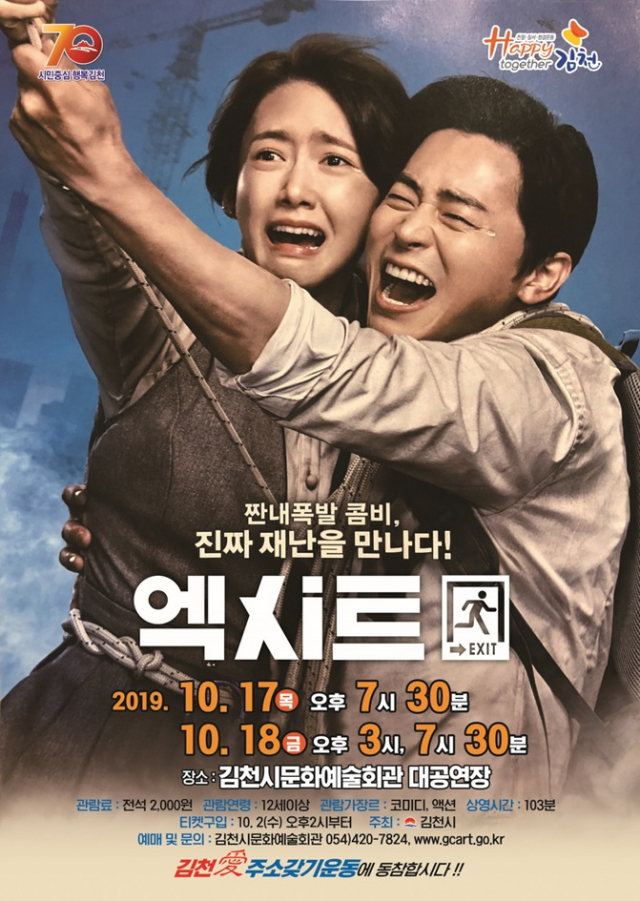 김천시문화예술회관(관장 김금숙)에서는 시민들의 건전한 여가문화 활성화를 위하여 특선영화 <엑시트>를 오는 10.월 17일 오후 7시 30분, 10월 18일 오후 3시, 7시 30분 총 3회에 걸쳐 김천시문화예술회관 대공연장에서 상영한다.