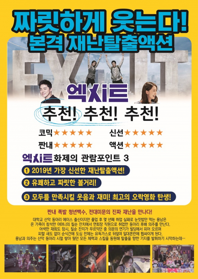 영화 <엑시트>는 주인공들이 대학교 산악동아리 시절 쌓아 두었던 모든 체력과 스킬을 동원해 유독가스로 뒤덮인 도시에서 탈출하는 내용을 담은 코믹 액션극이다. 짠내 폭발 청년백수가 어머니의 칠순잔치에서 동아리 후배를 만나면서 재난 상황이 벌어지는 일을 그린 영화로 조정석, 윤아, 고두심, 박인환, 김지영 등이 출연했다.
