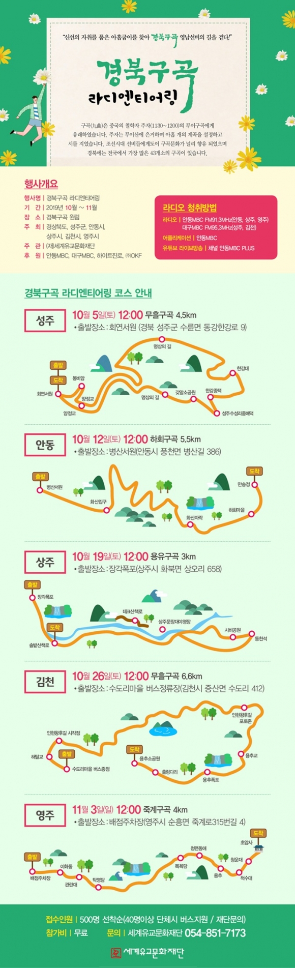 경상북도는 이달 5일 성주 무흘구곡을 시작으로 가을‘경북구곡 걷기 라디엔티어링'에 참가자 500명씩 모집하여 운영 한다고 밝혔다.