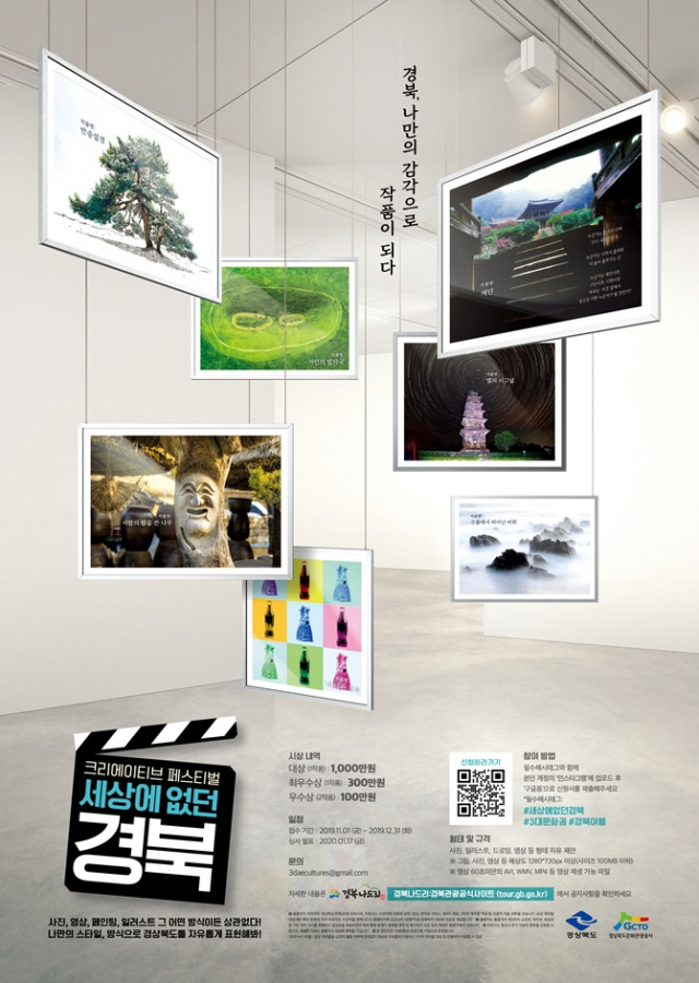 경상북도와 경북문화관광공사는 경상북도의 아름다운 모습을 나만의 감각으로 자유롭게 표현하는 크리에이티브 페스티벌 ‘세상에 없던 경북을 11월 1일부터 12월 31일까지 2개월간 진행한다고 밝혔다.