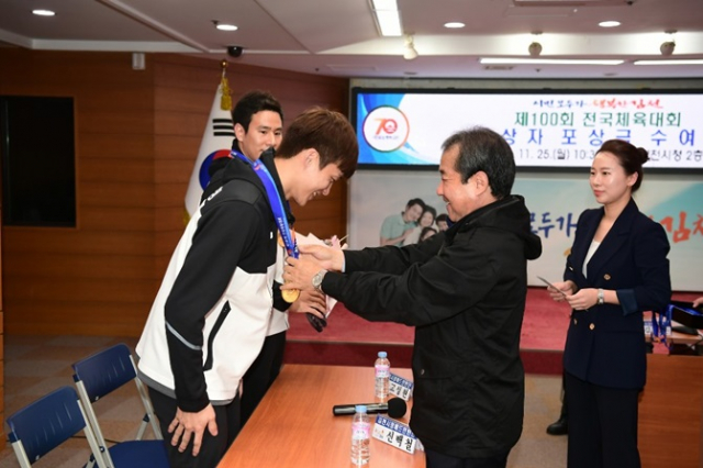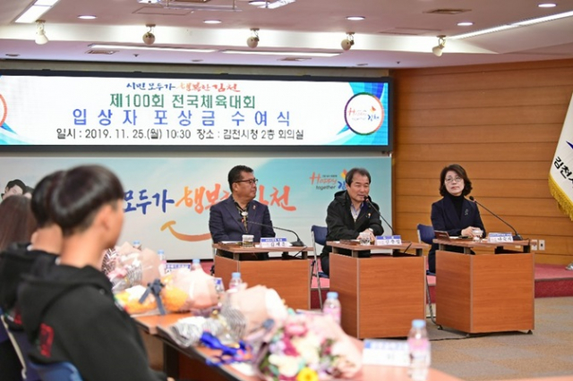 김천시체육회(회장 김충섭)는 25일 시청 2층 회의실에서 ‘제100회 전국체육대회’ 입상 선수에 대한 포상금 수여식을 개최했다.