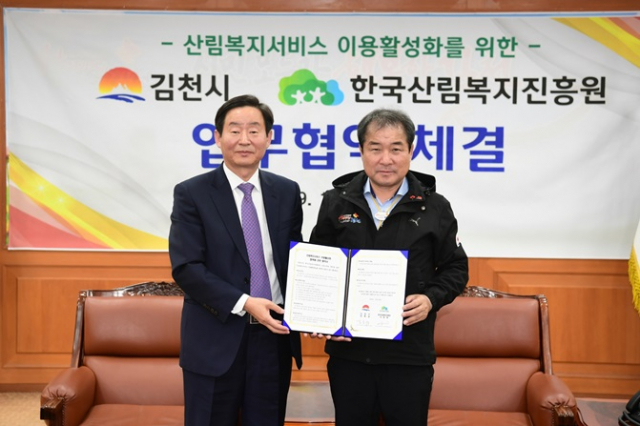 김천시(시장 김충섭)는 9일 산림청 한국산림복지진흥원(원장 이창재)과 김천시청 접견실에서 산림복지서비스를 확대・발전시키기 위한 업무협약을 체결했다고 밝혔다.