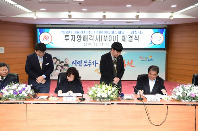 김천시는 18일 오후 3시 김천시청 회의실에서 김충섭 김천시장, 김세운 김천시의회 의장, 김정호 김천상공회의소 회장, 동원테크놀러지㈜ 박인숙 대표, ㈜에이디에스레일 신민호 대표와 함께 김천공장 설립을 위한 투자양해각서(MOU)를 체결했다.