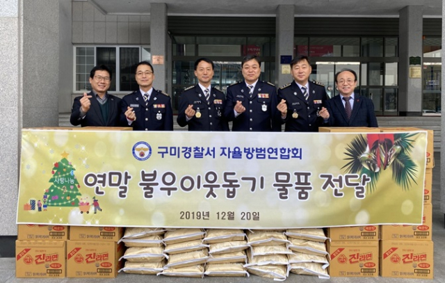 구미경찰서 자율방범연합회(회장 권강준)와 도량동 구포동의 ‘한우 잡는날(대표 정희철, 오금영)에서는 어려운 이웃들에게 쌀과 라면, 한우 등 사랑 가득 담은 성품을 준비해 구미시를 찾아 주위를 훈훈하게 하고 있다.