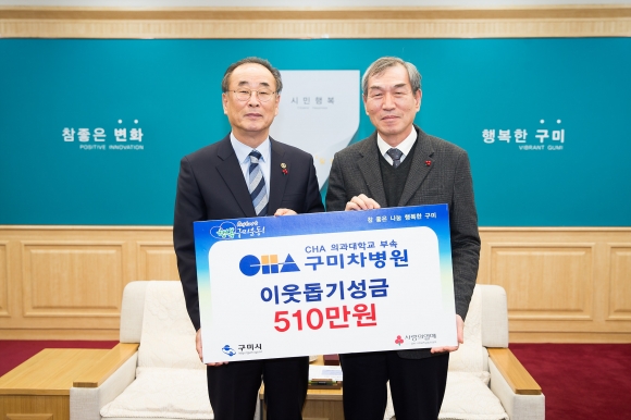 차의과학대학교 부속 구미차병원(병원장 김병국)이 지난 27일 구미시청을 방문해 ‘희망2020나눔캠페인’에 동참하기 위해 성금 510만원을 기탁했다.