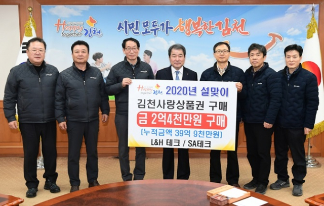 2020년 설 명절을 맞아 (주)앨엔에이치테크(L&H테크)와 (주)에스에이테크(SA테크)가 지역경제 활성화 및 지역 소상공인과 상생협력을 위해 17일 김천사랑 상품권 2억 4천만원을 구매했다.