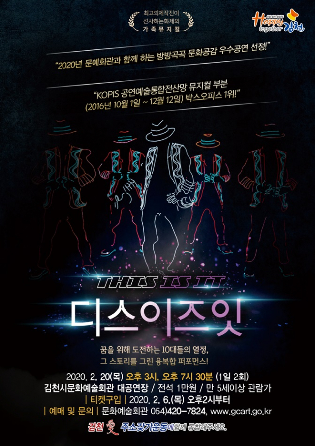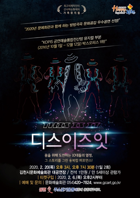 김천시문화예술회관(관장 김홍연)에서는 예술과 디지털 기술을 접목하여 모든 연령층의 관객에게 재미와 감동을 선사할 기획공연 ‘THIS IS IT’(디스이즈잇)을 오는 2월 20일 오후 3시, 7시 30분 1일 2회 김천시문화예술회관 대공연장에서 공연한다.