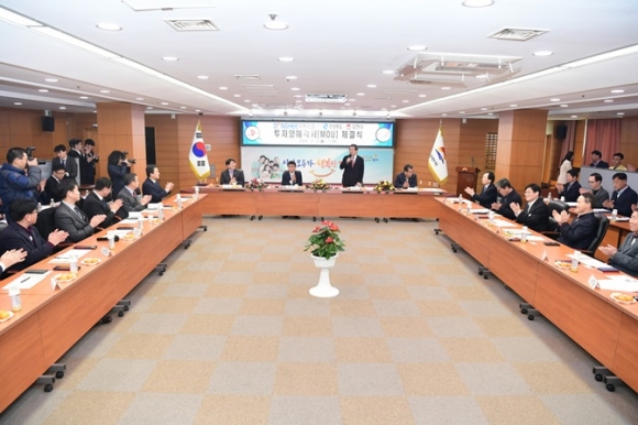 김충섭 김천시장, 동희산업 박주은 대표, 김세운 김천시의회 의장, 전우헌 경북도 경제부지사 등 20여명이 참석한 가운데 전기차 배터리케이스 생산공장 증설을 위한 투자양해각서(MOU)를 체결했다.