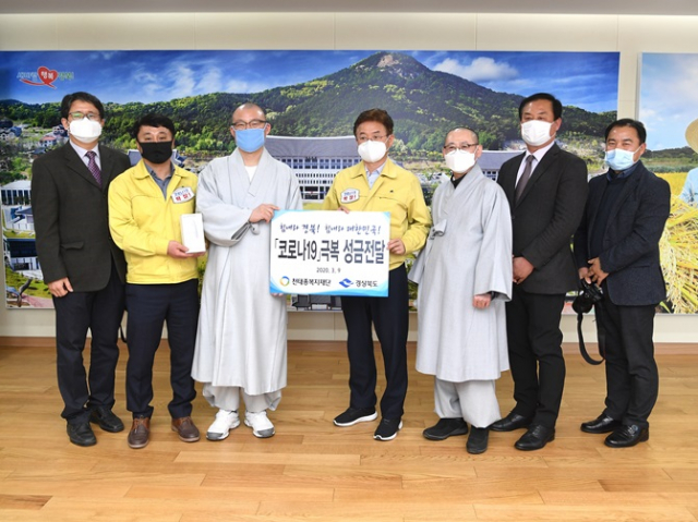 불교계의 기부도 이어졌다. 대한불교천태종 총무원 사회부장 도웅스님과 안동 해동사 주지 덕중스님은 9일 도청을 방문해 성금 1천만 원과 체온계 130개(1천3백만 원 상당)를 전달했다. 도웅스님은 “코로나19 극복을 위한 경북도 방역당국의 노력에 감사와 지지를 보낸다. 이 상황이 빨리 극복될 수 있도록 불교계에서도 열심히 기도하겠다”는 대한불교천태종 총무원장 문덕스님의 말씀을 전했다.