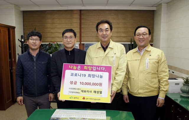1천만원을 기탁한 ㈜진양에스엔지는 태양광 발전시설 전문기업이며, ㈜진양이엔에스는 태양광 구조물 설계 및 제작하는 신재생에너지 선도 기업이다.