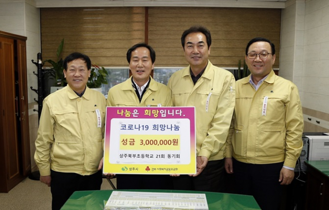 또한 상주북부초등학교21회 동기회 역시 상주시를 방문해 코로나19 특별성금 삼백만 원을 기탁했다. 김봉석 한양대 교수 등 서울, 경기, 대구, 부산 등 전국 각 지역에 거주하는 30여 명의 동기회원들이 고향 상주를 사랑하는 마음에서 십시 일반 성금을 모았다고 밝혔다.