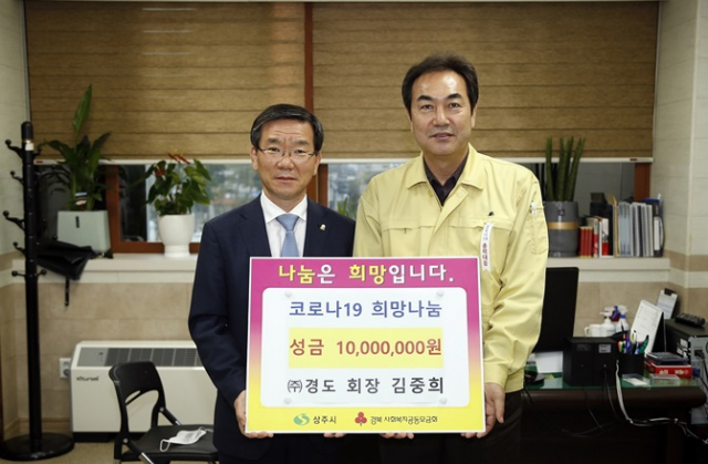 ㈜경도 또한 10일 상주시를 방문 코로나19 특별성금(일천만 원)을 기탁했다. 상주시 낙동면 출신인 김중희 대표는 상주시 중앙로에 본사를 두고 토목, 건축, 조경, 전기, 통신 등 종합건설업체를 이끌고 있다.