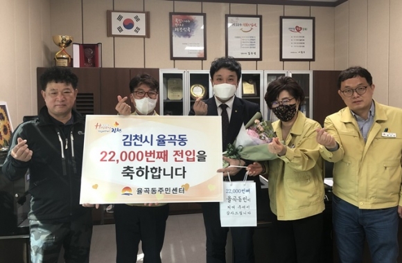 인OO씨는 “생각하지도 못한 뜻밖의 축하를 받아 놀랐다”면서 “김천시민이 되어 기쁘고 앞으로 이곳에서 행복하게 뿌리내리겠다”고 말했다. 이우문 율곡동장은 “어려운 시기에 김천으로의 이주를 결정한 분들에게 감사드리고, 새롭게 율곡동 주민이 되는 분들에게 불편함이 없도록 행정지원에 더욱 힘쓰겠다”고 전했다.