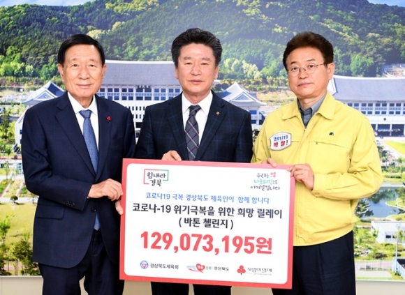 경상북도체육회는 14일 도청을 찾아 코로나19 위기 극복을 위한 체육인들의 성금 129백만원을 경북사회복지공동모금회에 기탁했다.