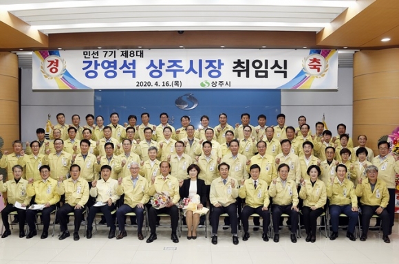 민선 7기 8대 강영석 상주시장이 16일 취임했다. 이날 오전 상주시청 대회의실에서 개최된 취임식은 약력 소개, 취임 선서, 취임사 순으로 진행됐다. 코로나19로 인해 사회적 거리두기 캠페인 등과 시장의 뜻에 따라 공식 초청 인사, 식전공연, 축사 등이 없이 간소하게 치러졌다.