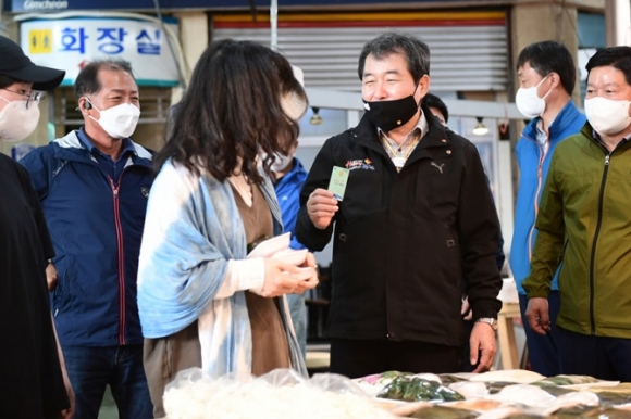 특히, 코로나19에 따른 소상공인 경영 부담 완화를 위해 총 사업비 약 38억원을 투입한‘소상공인 전기요금 지원사업’및‘카드수수료 지원 사업’에 대해 상인들에게 일일이 손수 설명할 뿐만 아니라 장을 보는 시민들에게는 지난 4월 27일 발행한‘김천사랑 카드’를 통한 소비 촉진을 권장하는 등 발로 뛰는 시정 홍보로 민생현장을 누볐다.