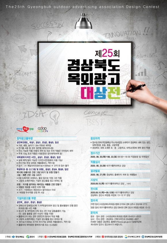 경상북도는 우수한 옥외광고 디자인 창작작품을 발굴․보급하고, 간판이 아름다운거리 조성과 품격 있는 도시경관 창출을 위해 (사)경상북도옥외광고협회가 주관하고 경상북도교육청이 후원하는 ‘제25회 경상북도 옥외광고대상전’을 개최한다고 밝혔다.
