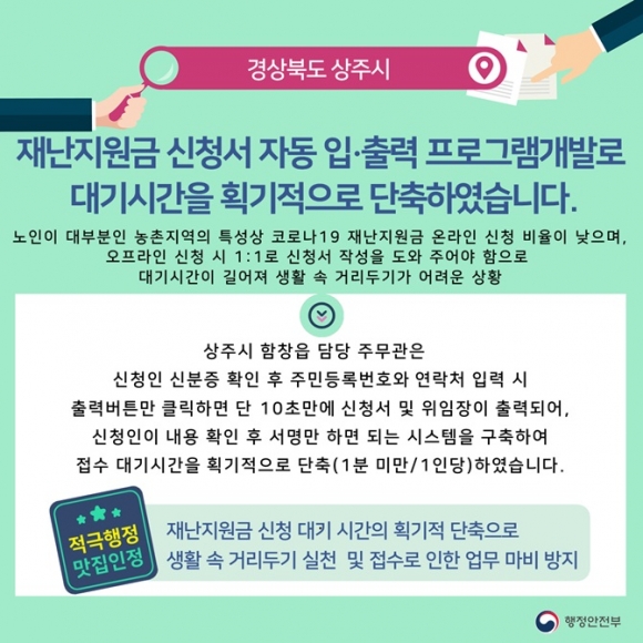 이를 본 함창읍 총무팀의 이효정(7급) 주무관이 아이디어를 냈다. 행정안전부가 가진 지급 대상자의 각종 정보를 신청서 작성 때 연계하는 시스템을 생각했다. ‘재난지원금 신청서 자동 입ㆍ출력 프로그램’은 이렇게 만들어졌다. 이는 신청자의 주민등록번호와 연락처를 입력하고 출력 버튼을 누르면 10초 만에 모든 내용이 적힌 신청서가 출력되는 시스템이다.