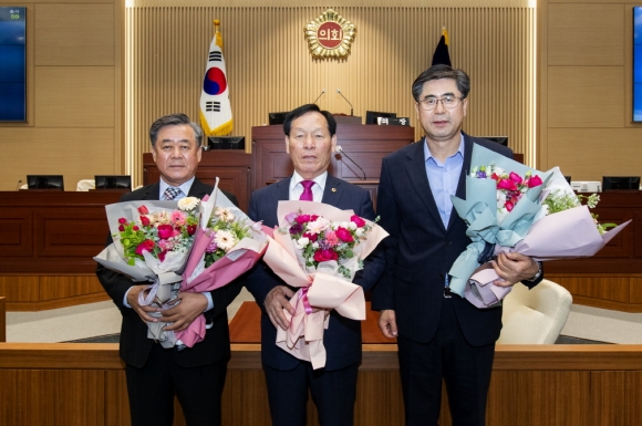 | ↑↑ 3일 경북도의회 후반기 의장단이 구성됐다. 김희수 부의장, 고우현 의장, 도기욱 부의장(왼쪽부터) |