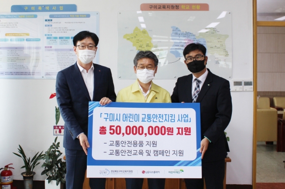 LG디스플레이(대표이사 사장 정호영)가 지난 6일 구미교육지원청에서 김상철 LG디스플레이 구미경영지원담당, 문희영 초록우산어린이재단 경북지역본부장 등 관계자 10여 명이 참석한 가운데 ‘구미시 어린이 교통안전지킴 사업’ 전달식을 가졌다.