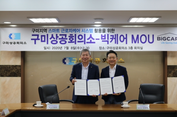 구미상공회의소(회장 조정문)가 8일 ㈜빅케어(대표이사 남경필)와 구미지역 스마트 근로자케어 시스템 활용을 위한 협약을 체결했다.